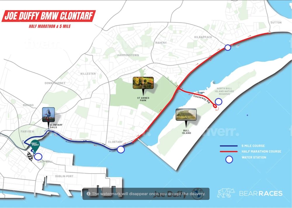 Runners go at 10am. Participants will run from Eastpoint Business Park turning right onto Alfie Byrne Road directly up onto the Promenade along Clontarf Road keeping to the walking path (beside the water). They will also be able to run on the grass beside the path where possible. Outbound runners will take a left (near the car park opposite St John the Baptist Church) continuing up the cycle path. This path takes them straight up past the Bull Island Wooden Bridge, where they run on the closed road outbound and on towards the Causeway Road and just before the Howth Road Junction. At this point they will return to the cycle lane and continue up along the promenade to the end of the cycle lane to the turnaround point. They U-turn here and run back along the cycle lane to the Causeway Junction where they will then turn left onto the Causeway Road doing an out and back loop, inside the coned lane around the roundabout at the end of this road. They will turn back up the Causeway Road within the bollarded area and turn left to James Larkin Road. Returning back along the cycle and walk paths they will continue along the Promenade, through Clontarf and down the Alfie Byrne Road and back into Eastpoint Business Park to the Finish Area.